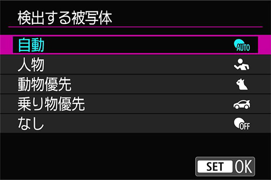 基本的な被写体検出の対象は同じですが、R6Ⅲにはカメラが被写体をAUTOで選択する自動というコマンドが増えました。特に被写体を決めていないときはとりあえず選んでおける便利な機能です。