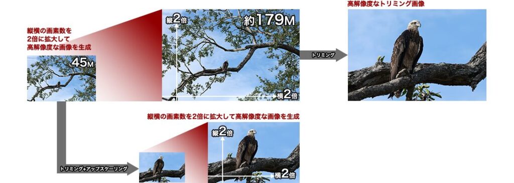 対してR5Ⅱはカメラ内でのアップスケーリングが可能で最大約1億7900万画素にまで画像を拡大できます。ハイレゾ撮影とは違い1枚の画像を処理するだけなので、より手軽に超高解像度の画像を作成できます。