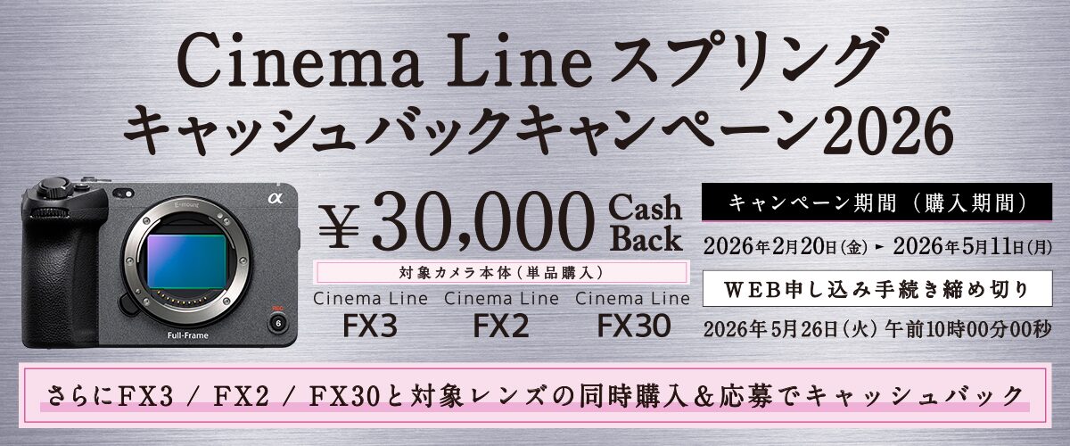 季節ごとに実施されるソニーのキャッシュバックキャンペーンが2026年春も実施されます。今回は2025夏に発売されたばかりのFX2がさっそく3万円のキャッシュバック対象となっています。さらにカメラ本体とレンズの同時購入で追加のキャッシュバックが得られます。