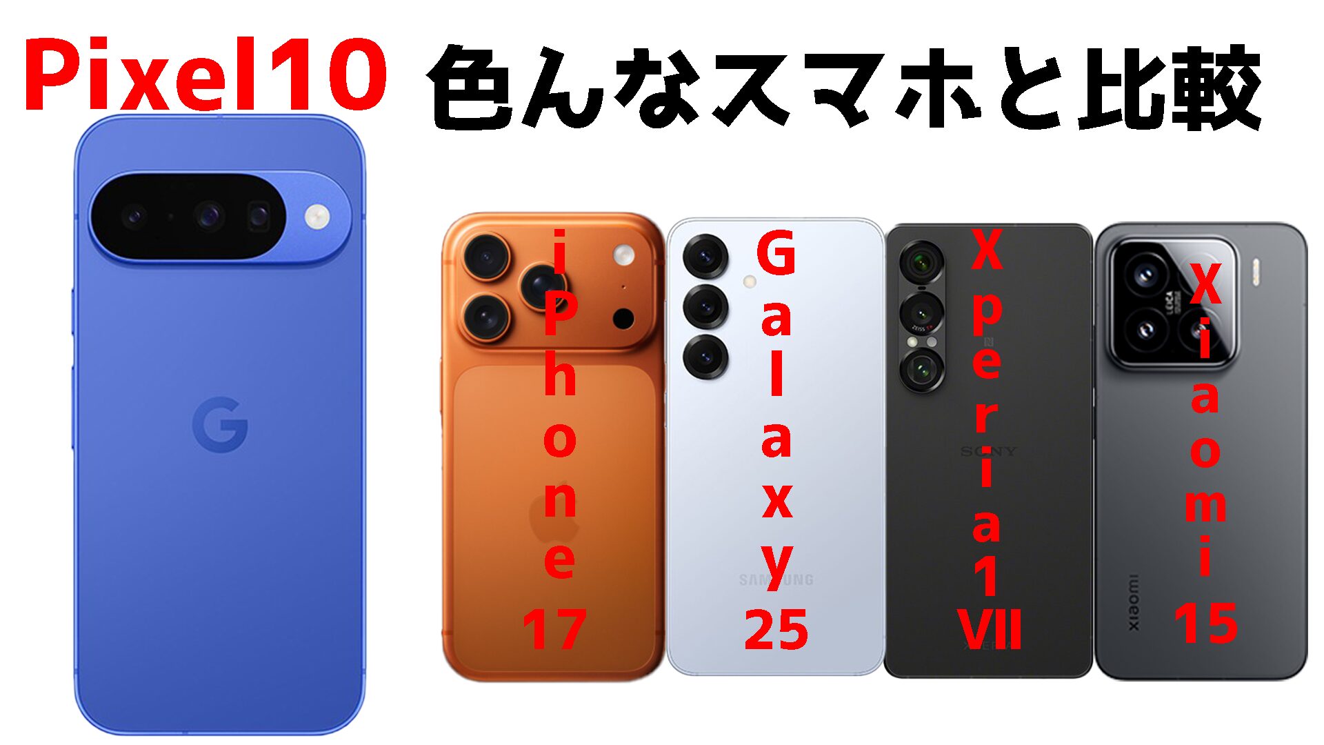 項目 | Pixel 10 | iPhone 17 | iPhone Air | Galaxy S25 | Xiaomi 15 | Pixel 10 Pro | iPhone 17 Pro | Xiaomi 15 Ultra | Pixel 10 Pro XL | iPhone 17 Pro Max | Galaxy S25 Ultra | Xperia 1 VII | Pixel 10 Pro Fold |